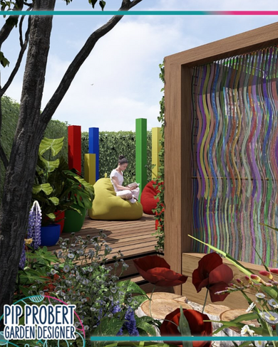 PLAY: The garden will feature interactive sensory elements including a sensory pergola with coloured ribbons, a slinky wall, musical instruments, texture panels, a LEGO panel, and a blackboard. Children can explore a peephole plank pathway, a tall steppingstone route leading to a raised deck, and fun seating options such as bean bags and a hammock. A slide will add an extra element of excitement and adventure.